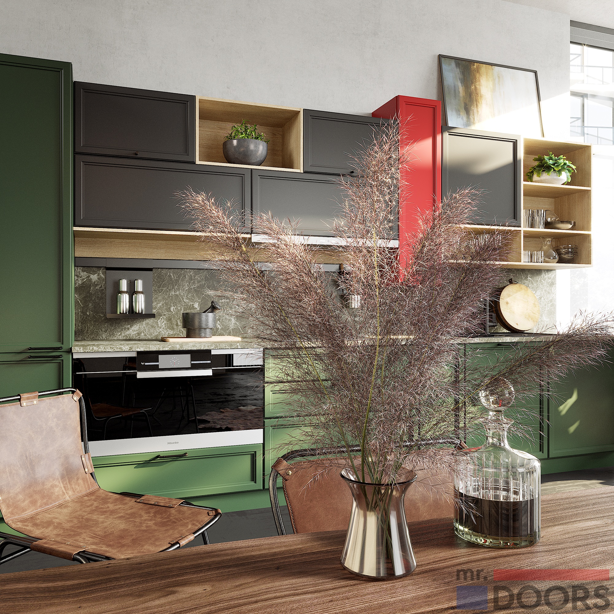 Если вы предпочитаете нестандартные решения и ищете идеальный проект для оформления кухонной зоны, обратите внимание на этот гарнитур. Элегантная модель, декорированная вставками разных оттенков подходит для тех, кто привык выделяться. Яркий акцент — красный модуль, подчеркнет вашу индивидуальность.