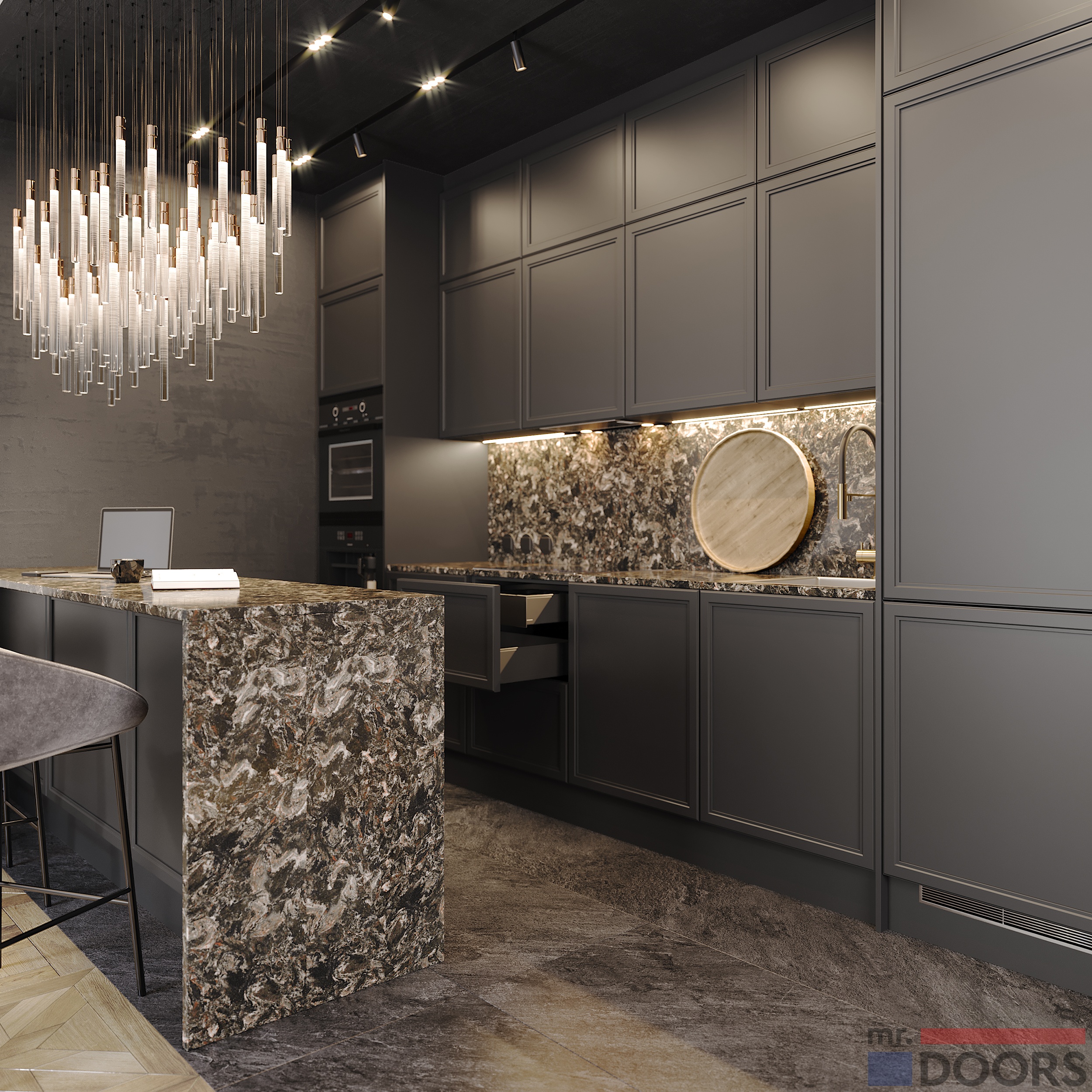 Создайте уютную и элегантную атмосферу на кухне с помощью прямого кухонного гарнитура от производителя мебели Mr.Doors. Фасады гарнитура выполнены в сером цвете (декор «Сета Графит»), который придает интерьеру особый шарм и изысканность. Благодаря высокому качеству материалов и идеальной пропорции, гарнитур порадует своей практичностью и стилем. В кухне есть множество шкафов для хранения принадлежностей и продуктов. Предусмотрены ниши для размещения встроенной бытовой техники.