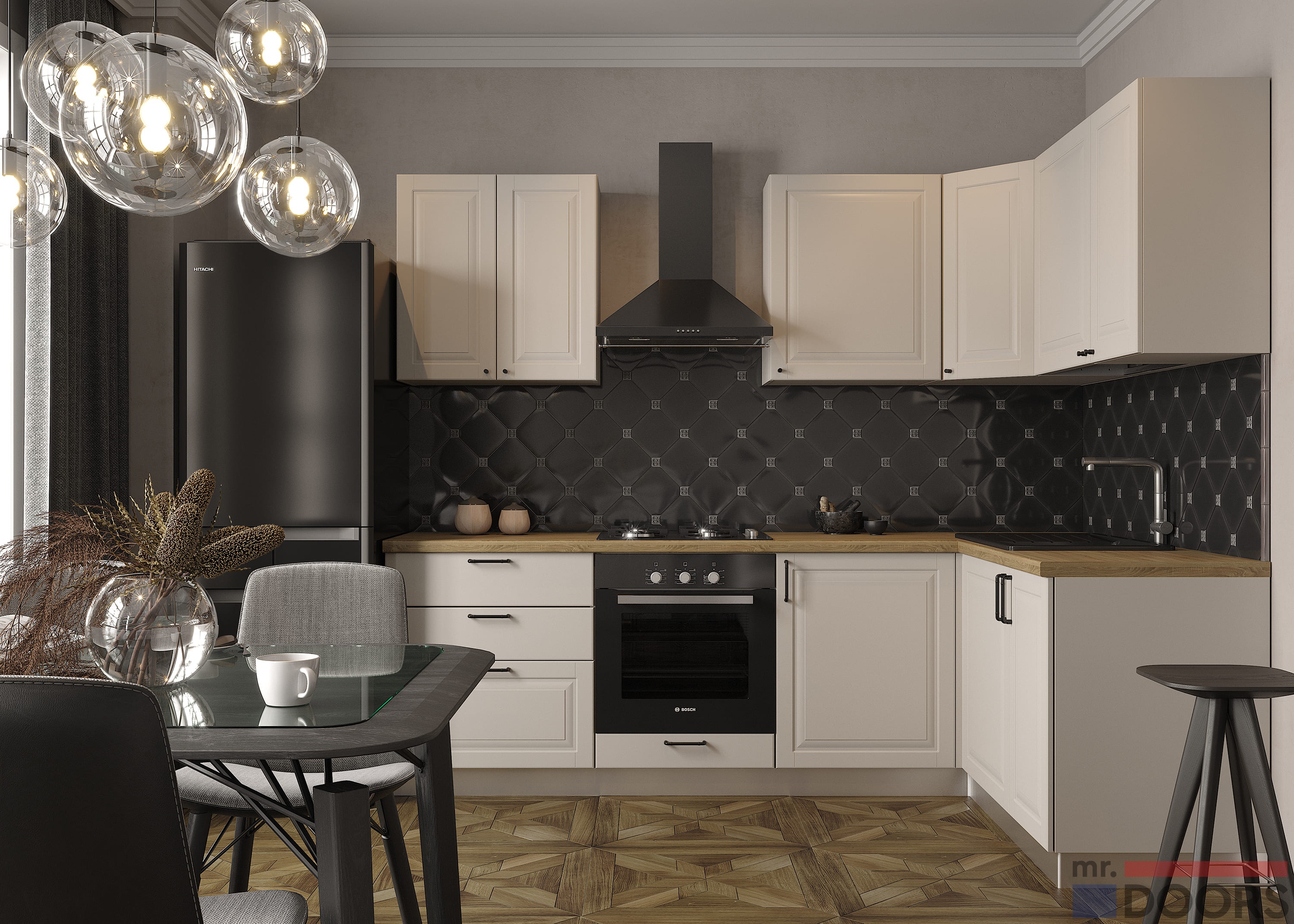 Мебельная компания Mister Doors предлагает уникальную кухонную мебель, состоящую из углового гарнитура с изысканными фасадами, которые окрашены эмалью в цвете «Кашемир». Благодаря продуманной планировке и качественному наполнению, доступный экземпляр обеспечит всем нужным для комфортной работы, а также станет красивым дополнением вашего интерьера.