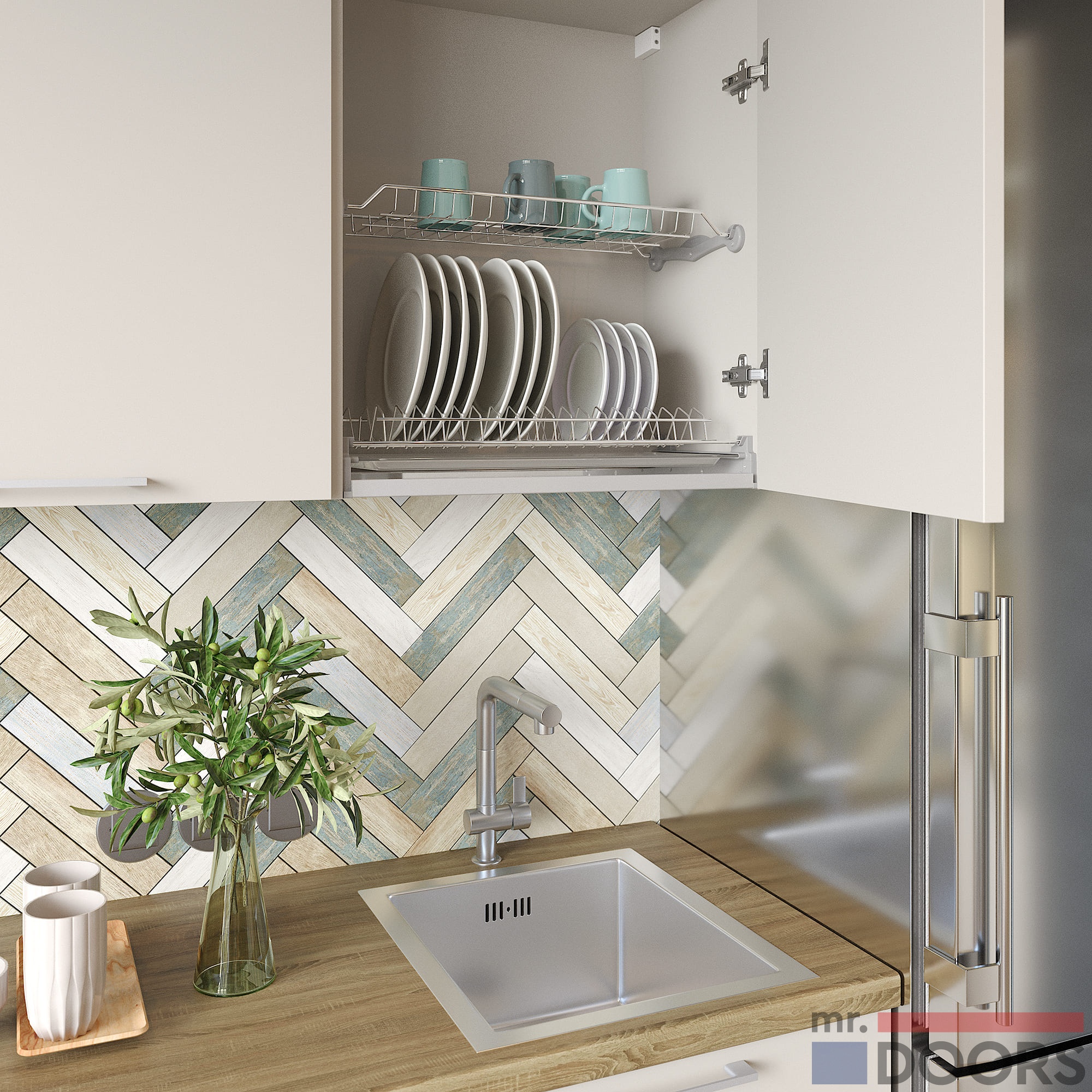 Кухня от мебельной мастерской Mr. Doors оснащается качественной фурнитурой, которая выдерживает большие нагрузки. Мы используем в проекте петли и доводчики импортных производителей, поэтому вы не столкнетесь с провисанием или иными проблемами с открыванием фасадов. Чтобы использовать площадь стены эффективно, верхние шкафчики могут быть подняты до потолка, что позволит организовать дополнительное место хранения.
