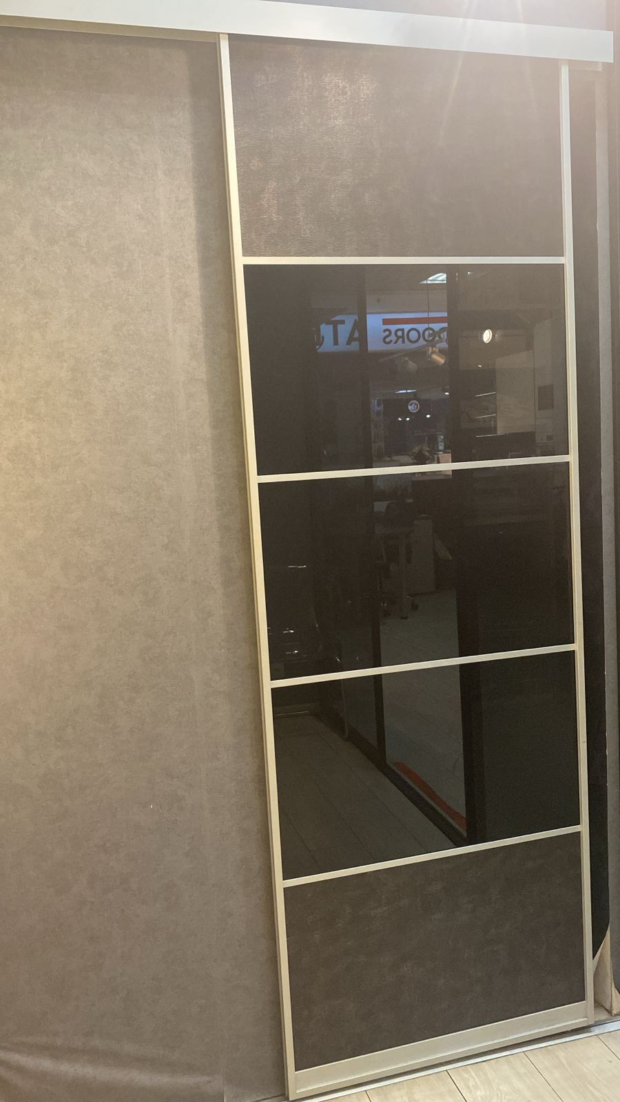 ДВЕРЬ ВИЗИО Т ПОДВЕСНАЯ Т 5-ти фрагментная рама /треки цвет матовое серебро MS , вставки: Стекло матовое ЧЕРНОЕ/ ЭКО КОЖА