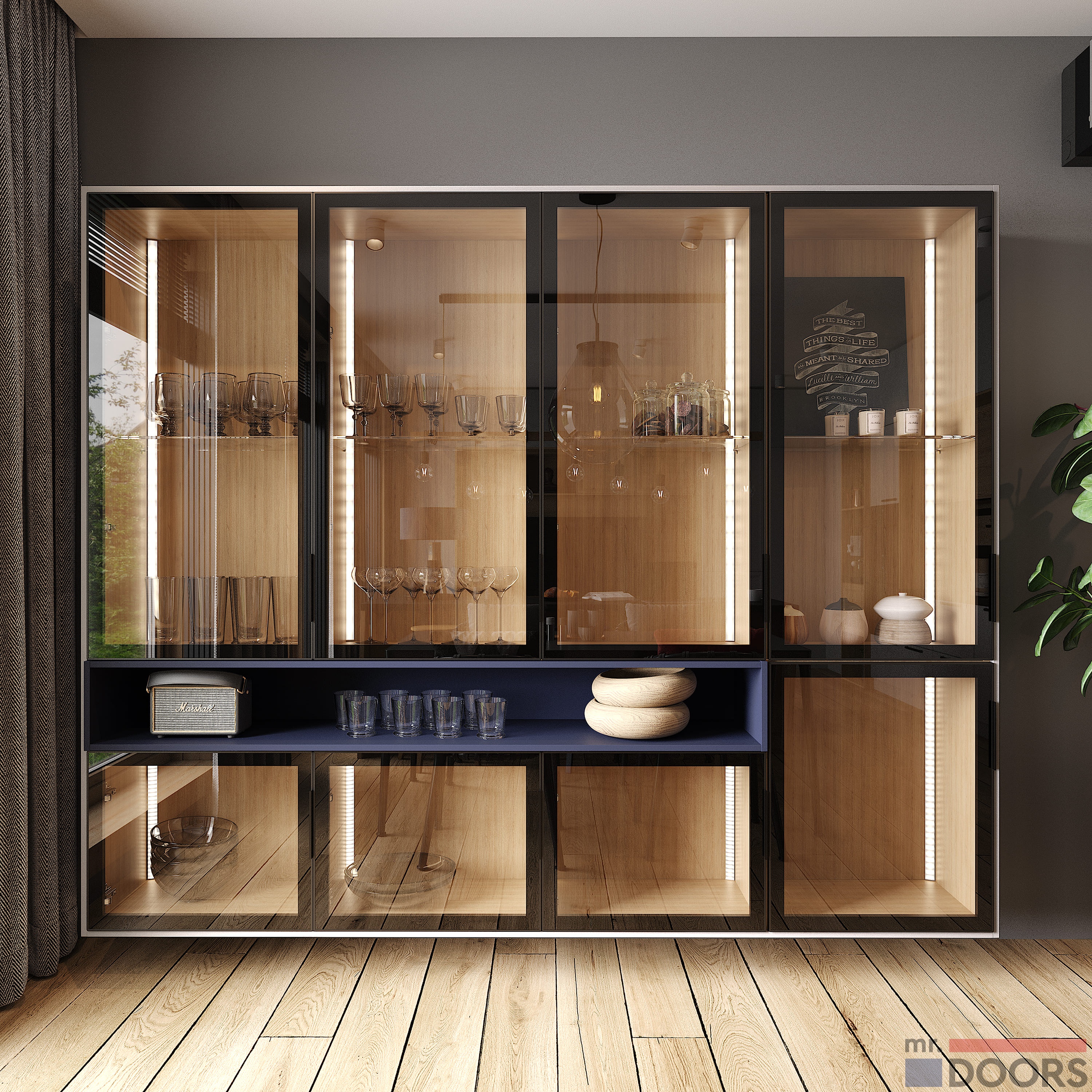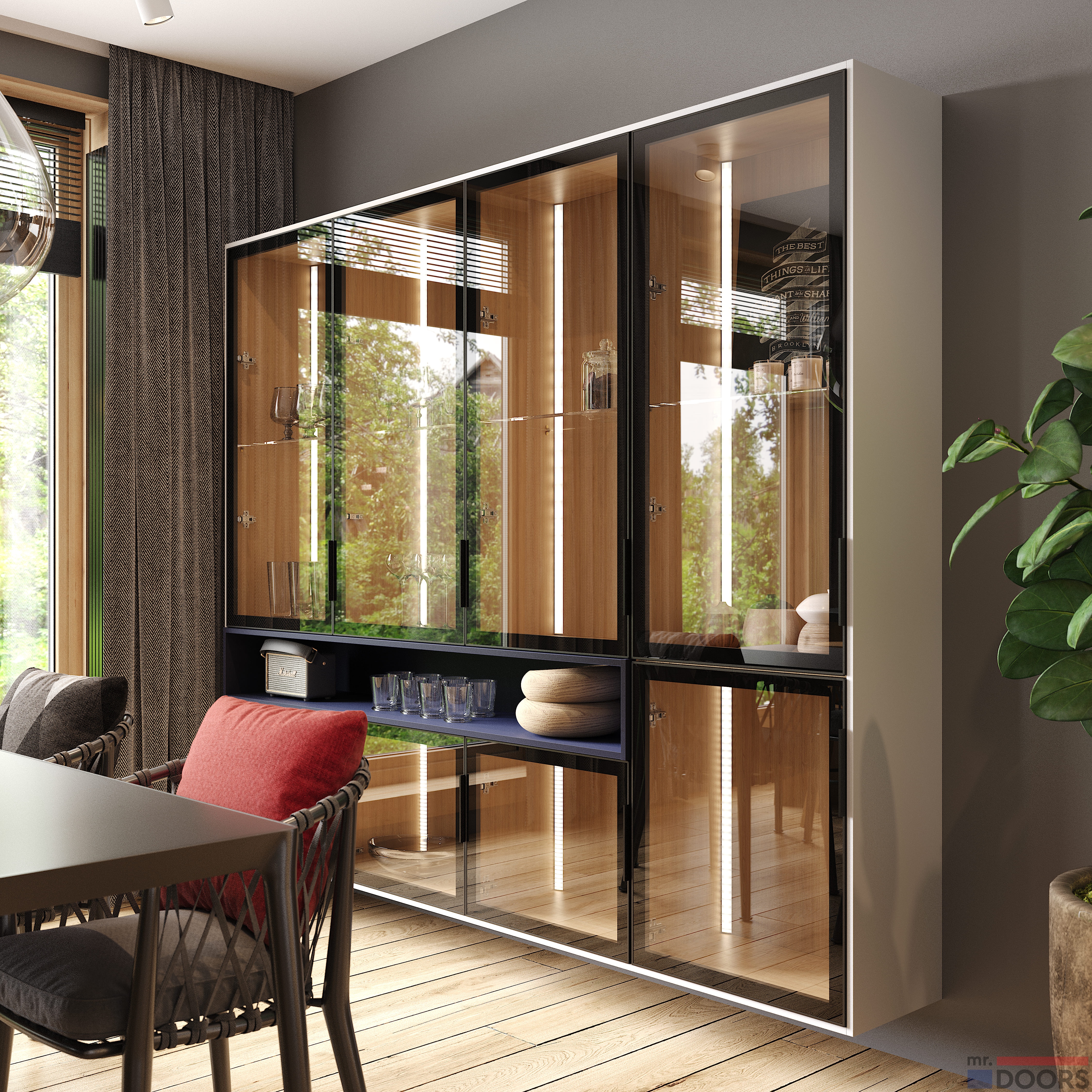 Особенно гармонично эта модель будет смотреться с интерьерами в стиле ар-деко, неоклассика и лофт, но в современном минимализме будет выглядеть не менее выигрышно. Вертикальная LED-подсветка подчеркивает содержимое шкафа и создает особый уют в помещении. Благодаря такой подсветке можно уйти от верхнего освещения.