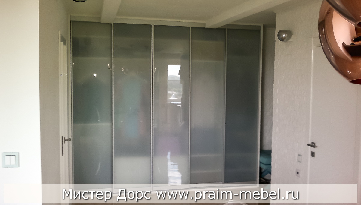 Гардеробный шкаф с дверьми – купе из алюминиевого профиля серии «Нотеборн А» (Нидерланды). Видимая часть продольной рамы всего 16 мм, декор «Матовое серебро».