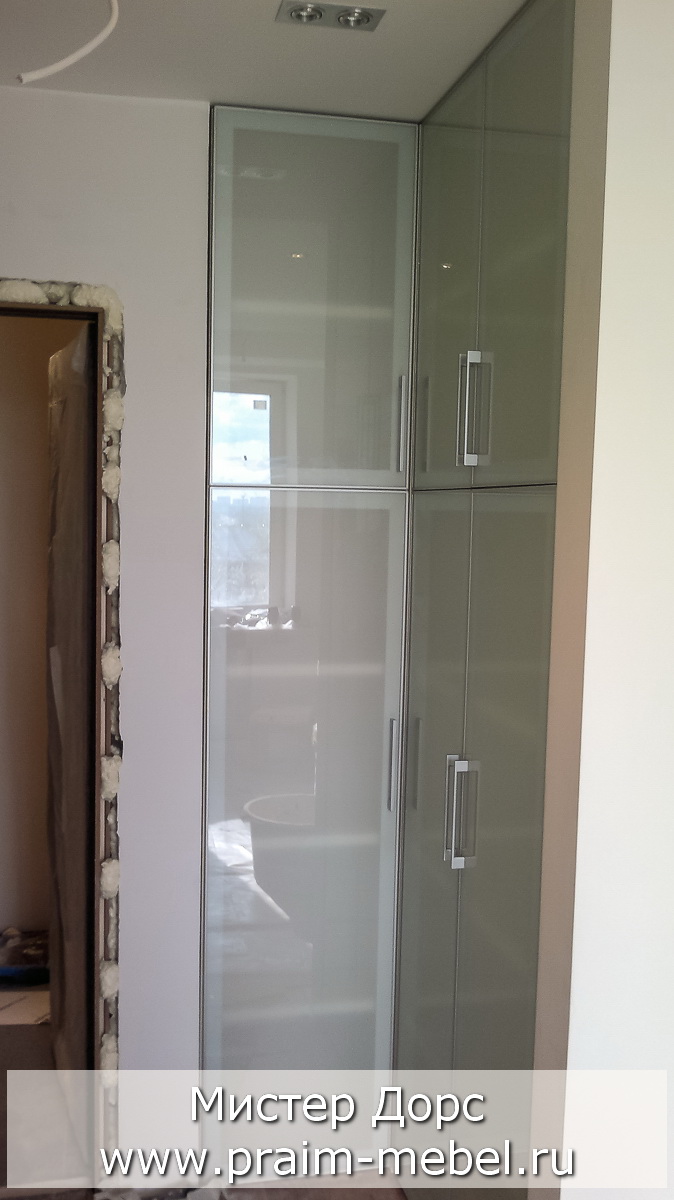 Встроенный угловой шкаф с распашными полупрозрачными дверьми, выполненный по индивидуальному проекту.